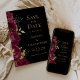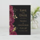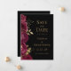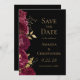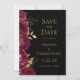 Den här eleganten har ett modernt bröllop spara datum-kort gräns av burga blommor och guld faux foil löv. Anpassa guld-färgad-texten på en svart bakgrund. Kortets baksida är starkt svart.