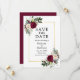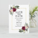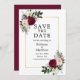 Modern Elegant Watercolor Burgundy Blommigt Förlovning Bröllop Annoncement Save Datakortet omfattar peonier, lilies, eukalyptus löv och annan vacker grej på guld ram.