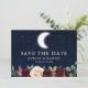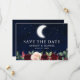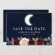 Celestial Save the Date förlovning Notification Card. Vattentärsblå natten himlar med stjärnor och måne. Blommigt för vattenfärg Burgundy Blue Rosa. Greenery Eucalyptus Löv.