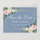 Vattentärsfärgad Rosa Vit Blommigt Dusty Blue Spara Postkort för meddelande om datum Förlovning omfattar rosa ros, vita blommor och botaniskt grönt på guld ram.
