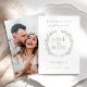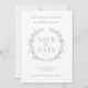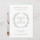 Upplev sofistikering med den här eleganten och modern rustik Spara datuminbjudan, med vattenfärgsgröna löv och delikata vita blommor i en känslig andedräkt. Anpassa inbjudan ytterligare med ett pars foto på baksidan.