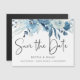 Elegant vattenfärgen dammig blå och marin blommigt arrangemang, bröllop spara datum magnet. Kortet har elegantens kalligrafi "Save the Date"-skript.
