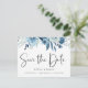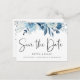 Elegant vattenfärgsdammblått och marin blommigt, bröllop spara datum vykort. Kortet har elegantens calligrafi "Save the Date" (Spara datum), på framsidan och baksidan.
