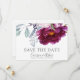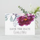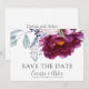 En botanisk blommigt med lush elegant vattenfärg sparar datumet bröllop-meddelande i nyanser av rött violett och rosa med bladgrej. Skripttyp kontrasterad med klassisk och tidlös serif-typografi. Modern elegans.