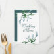 Ett menykort för Blommigt- och bröllopsmottagning, med vattenfärg grenar i blå grönt, på vit bakgrund. Omvänt visas menytexten fullt i en blå grönt med vit text. Om du vill anpassa det här kortet infogar du bara menymarkeringsobjekt i mallen steg för steg. Se till att du kan visa hela samlingen för Blommigt Bröllop i vattenfärgen Blå Grönt.