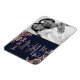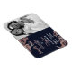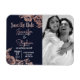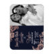 Elegant, chic och enkel, modern utskrift av blommor och typografi i ro guld på den moderna marinblå bakgrunden, magneter med Spara-till-datum-bröllop-kort. Denna klassiska och sofistikerade utformning är perfekt för det trendig och det snyggt som gifter sig. Anpassa med ditt eget meddelande på framsidan och en anpassad inledande monogram på baksidan. All fotoutskriftsdesign.