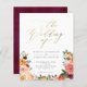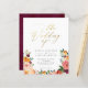 Elegant blommigt bröllopsinbjudan med "bröllop av" i faux guld skript mot en vit bakgrund med och burgordiska vattenfärgblommor och löv vid grund där detaljerna om bröllop anges. Som en del av budgetvalet här om Zazzle, bjuder dessa in kom i begränsada storlekar och pappra lagrar. Om du behöver ett annat storlekt eller pappert lagrar kan du överföra den här designen till ett standardformat 5x7 med hjälp av verktyg för designöverföring för fler alternativ.