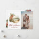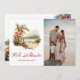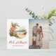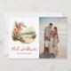 Vattenfärgsfotot Mele Kalikimaka-helgdag med en vattenfärgstryck av en tropisk strand med blommor och ett Julhälsningar skript i ett handskrivet skript på framsidan och en vattenfärgsstrand och illustrationer av blommigten längst bak. Anpassa enkelt det här vackra helgdag med foton och text.