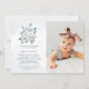 Dessa vackra baptisminbjudningar har trendiget vattenfärg stil och elegant blå text. En bukett av mjukt dammblått och vita blommor och grönt eucalyptus botaniskt löv dekorerar ett kor, med passande stänk av subtil blått vattenfärg på vit bakgrund. Lägg till ditt favoritfoto från baby.