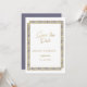 Elegant bröllop Spara datuminbjudningarna med en modern geometrisk design i guld, accentuerad med mjuk lavender och blommigtar för rosa. Perfekt för romantiskt och snyggt firande. Tryckt på premiumkartonger med anpassade. En vacker blandning av sofistikering och charm. Alla designer skrivs ut.