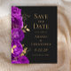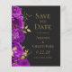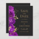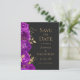 Det moderna bröllop spara datum-kortet i elegant har en gräns av lila blommor och guld faux foil löv. Anpassa guld-färgad-texten på en mörk svart bakgrund. Kortets baksida är massiv skiffersvart.