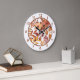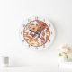 Den söt hösten och golderna i mitten av denna klocka är attraktiva och lämpliga hela året. De varma tonerna ingår i blommor, löv och stammar. En cirkulär som matchar brunt ram separerar siffrorna från blommigt bilder och allt placeras på vit bakgrund.