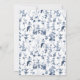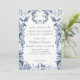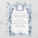 BLÅS- OCH VITINOISERIE STIL WEDDING-INVIKATION | 5 tum x 7 tum rektangulär lodrät design. Elegant gräns-blommans blommigt i Delft marblå, ljusblå med vita blommor och mörk löv blad grönery. På baksidan finns en blomma i mönster och fjärilar tillsätts. Visas i vitt, men du kan lägga till vilken bakgrund som helst i färg som du vill ha bakom teckningen. Det finns en fullständig uppsättning produkter att köpa i samlingen. Skapat av internationellt licensierad konstnär och formgivare, Audrey Jeanne Roberts ©.