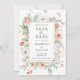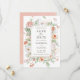 Den här blommigten för persikor med elegant sparar datuminbjudan och har en design som har en blommigt ram med vackra persikor och vita blommor med grönt och vitt rosett band, med accenter från ro-guld.