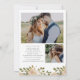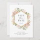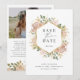 De här bedövande bröllop spara datum-korten har ett faux-guld-geometriskt ram omgivet av lush, vattenfärgsblommor i neutralt, färg med jordtoner såsom beige persika, dammig ro och mjuk grönt med neutralt accents och guld. En elegant boho-blommigt ser ut som en vit bakgrund. Kortets baksida innehåller två av dina personliga foton och rum för ytterligare text eller information.
