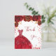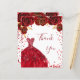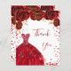 Ett feminin- och elegant födelsedagstack. En vit bakgrund med röd faux glitter, gnistor, röd ros och röd klänning. På framsidan finns ett skript med stora bokstäver och texten: Tack. Tillbaka: Anpassa och lägg till tackkort och namn. Namn är skrivet med ett modernt handskript i stil.