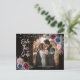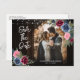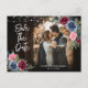 Personlig vattenfärgsblått, burgundärt och bröllop-foto spara vykortet med vackra botaniska arrangemang på ett lingträ som är försett med strängträ av ljus. Anpassa enkelt din händelseinformation. Matchande objekt som är tillgängliga för att komplettera fotot i den här blommigten bröllop sparar datumvykorten.
