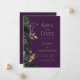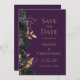I eleganten finns det ett modernt bröllop spara datum-kort gräns av svarta blommor och guld faux foil löv. Anpassa guld-färgad-texten på mörkens lila-bakgrund. Kortets baksida är solid lila.