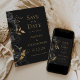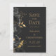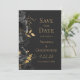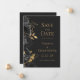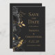 I eleganten finns det ett modernt bröllop spara datum-kort gräns av svarta blommor och guld faux foil löv. Anpassa guld-färgad-texten på en mörk svart bakgrund. Kortets baksida är massiv skiffersvart.