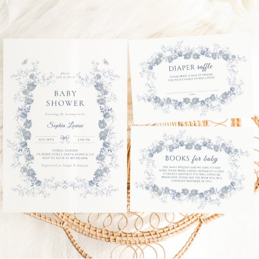 Blommigten Toile de Jouy Dusty Blue Chinoiserie Tack Kort