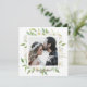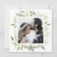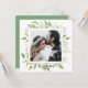 Enkelt och klassigt är dessa bröllop spara datum perfekten för att meddela alla era vänner och familjer om er stora dag, vår eller sommaren, firande. Innehåller handmålade vita vattenfärgblommor med grönt löv och löv som omger en fotomall. Baksidan har en matchande grönt färg med vita färgfläckar. All brun text är anpassade.