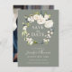 Skicka ut vackra bröllop spara datum-kort med en delikat vit vattenfärgsutandning av ro, blommigt, vattenstånd, blandade blommor och sluttande grönsak över en populär grönt. Ett modernt handskrivet skript av typen ansikte spådomar vackert ut namn i bruden och brudgummen. På baksidan av kortet finns en fotomall som du kan använda för att ladda upp önskat foto.