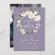 Skicka ut vackra bröllop spara datum-kort med en delikat vit vattenfärgsutandning av ro, vattenstånd, blandade blommor och sluttande blommigt över en populär lavendel lila bakgrund. Ett modernt handskrivet skript av typen ansikte spådomar vackert ut namn i bruden och brudgummen. På baksidan av kortet finns en fotomall som du kan använda för att ladda upp önskat foto.