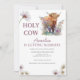 Blommigt Heliga Cow Print Inbjudningskort för möhippan med en höglandskost med vackra blommigtar som lätt kan anpassas till din egen.
