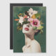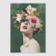 En fängslande digital grafik av en kvinna med blommor och en liten grej som tillrättavisar hennes ansikte, som döljer hennes ögon och skapar en känsla av mysterium och naturanknytning.. Hennes mjuka, stiliserade egenskaper står i kontrast till de pulserande blommorna och lövet, medan bakgrunden till grönten av riken belyser skönheten hos hennes blommigt krona. Sammansättningen blandar surrealism och elegans, vilket innebär en harmoni mellan mänsklig form och natur.