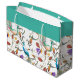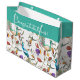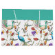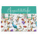En färgad exotisk fågel mönster med fredsockar och blommigt inslag presenterar era gåvor i utmärkande stil. Färg omfattar turkos, rosa, gult, lila, rost, grönt, guld och blått med en turkos gräns över väskan med texten "Grattisar!". Du kan redigera den här texten om du vill använda en annan ordalydelse.