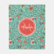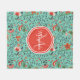 En filt av akvamarin-färgad med söt orange-röd och persikofärgad blommigt med marin och grönt löv. Anpassa genom att lägga till ditt namn och monogram till körsbärstomatens röda, rundade oktonmärke. Detta ingår i Aquamarine-Blommigten Cherry Tomato Red Monogram Collection.