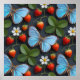 Ett fantastiskt, detaljerat sömlöst mönster med ömtåliga blå morpho-fjärilar mitt i en fläck vilda jordgubbar. Designen inkluderar mogna röda bär, vita jordgubbsblommor med gula centra och livfulla gröna trefingrade blad. Mot en mörk skiffergrå bakgrund skapar det iriserande blå på fjärilsvingarna en strålande kontrast.