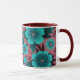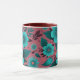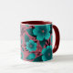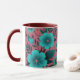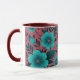 Ett sjudande blommönster med stora blommor av teal-färgad och löv av lush-grönt arrangeras på ett konstgjort sätt på en rik maronbakgrund. Utformningen omfattar olika former av löv och mindre blommor, vilket ökar djup och kontrast till den totala sammansättningen. Denna utformning är idealisk för använda inom textil-, tapet- eller digitalkonst-projekt som söker en balans mellan djärvt färg och naturligt inslag.