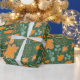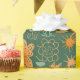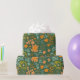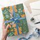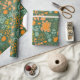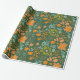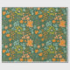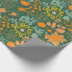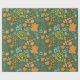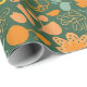 Sömlöst blommönster på mörkgrön bakgrund med stiliserade orange, gula och turkosa blommor, blad och abstrakta former.