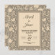 Det är en bröllopsinbjudan som är söt designad med blommönster och bladmotiv. Den har också en modern typografisk layout med eleganta typsnitt. Baksidan har ett konstnärligt element med hela mönsterdesignen.