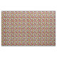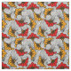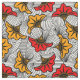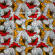 Traditionell afrikansk ankara stil med mönster, med röd och guld biloba blommor över en svart och vit geometrisk bakgrund