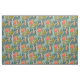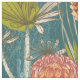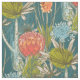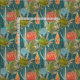 En abstrakt afrikanskt botaniskt mönster i skuggor av orange, burgundi, blått och grönt på en tårblå bakgrund.