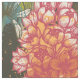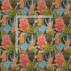 En abstrakt afrikanskt botaniskt mönster i skuggor av orange, rött, blått och grönt på mörkens bakgrund.