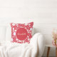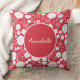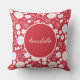 Grädde och rödblommor i ett blommönster för fångst av öga med utrymme för en namn av annan anpassningsbar om så önskas. Den här fantastiska blommigtens blomdesign är sofistikerad elegant och fantastisk biet. Blommönstret består av variationer av många blommor, både små och stora, partier av petaler, eller bara ett fåtal, vassa, halvrunda eller rundade. Bakgrunden färg till denna kudde i blommigten är en mörk som är förtryckt. Utrymmet att lägga till ditt eget namn är i en cirkel. Blomdesignen upprepas både framifrån och bakifrån.