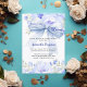En vit elegant, dekorerad med en stor blå båge och blåa blommor. Anpassa och lägg till information om namn och party. Text på bågen: Baby i Bloom Back: baby blue bakgrund.