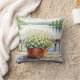 Söt dekorativ kudde med en vacker illustration av vita blommor i en kopparkruka med baksidan av en serene sjö med gräs träd.