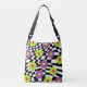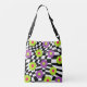 Kroppssäcken i Toppen groovy kor har blommor av funky i blad av kalkgrönt, lila av söt och shock rosa mot en svart och vit bakgrund i abstrakten.