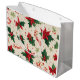 Lägg till en fin fläck till din helgdag-gåva med den här julklappsäcken i öga! Den här väskan fångar säsongens magi med vibrerande röda poinsettias, löv i grönten och lekfulla polkagrisar, som alla är riktade mot en varm krämbakgrund. Sprinklad med gyllene stjärnor och delikat snöflingor, det är perfekten att leverera julklapp med varje gåva. Vare sig det gäller familj, vänner eller medarbetare får den här charmerande väskan helgdag att känna extra speciellt