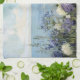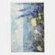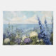 En mjuk kustmålning i lätta pasteller, med lila, blått och vita blommor med ömtålig grön blommigt och en stillastående havsvy i avstånd, perfekt för cottagecore eller stil vid kusten.
