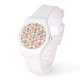 En söt blommigt Sporty Wristwatch, med en färgstark mönster av Rosa och Orange Flowers och Polka dots på en löv-texturerad Ecru-bakgrund. I Posh & Painterly 'Rangoli'-samlingen kan mönster justeras så att det passar valfri Wristwatch.