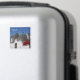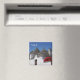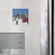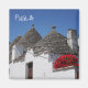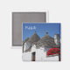 Fotomagnet från Souvenir med röda geranblommor och en rad koniska traditionella tullihus med tak på en gata i Alberobello-staden i Apulien, södra Italien med texten "Apulien".