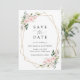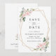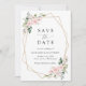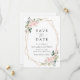 Vänner och familj i inbjudan i stil och ange tonen för din speciella dag med den här charmen spara datumkortet. Utformningen har vattenfärgsblommor, grönt och guld ram på vit rosa.