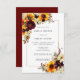 Golden sunblomma, mörk röd ros och elfenbensvita vattenblommor kapas i höst löv och bär. De dekorerar ett guld ram som omger dina möhippor. Baksidan av inbjudningskort för möhippan är djup burgundröd. Det här objektet koordinerar med samlingen Solros och Burgundy. Den innehåller de mallar som du behöver för att skapa en inbjudningskort för möhippan-svit och party-förråd.