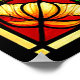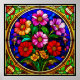 Livfull glasmålning som visar en samling färgglada blommor, intrikat arrangerade i en konstnärlig komposition, lämplig för dekorativa, konstnärliga och inspirerande användningsområden.