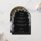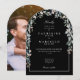 En elegant bröllopsinbjudan med vildblommor i akvarellstil och blomsterbåge som ramar in detaljerna om er bröllopsfest med elegant vit typografi på en stilren svart bakgrund. Med ert speciella foto på baksidan. Designad av Thisisnotme©